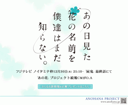 Studio A-1 Pictures, producer Aniplex, and broadcaster Fuji TV have revealed a new anime “project” nicknamed “Anohana Project.” The nickname has been revealed to be an abbreviation for “Ano hi Mita Hana no Namae wo Boku-tachi wa Mada Shiranai” (We still do not know the name of the flower we saw that day). Further information about this new original anime will be revealed during a commercial broadcast in the early morning hours of December 31, during the broadcast of the final episode of the Shiki Noitamina series.