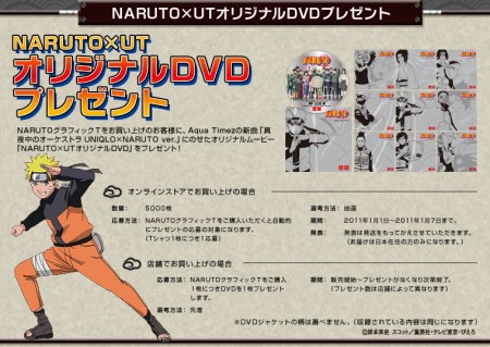Starting January 1, UNIQLO clothing stores in Japan, Taiwan, Singapore, Korea, and France will give away an exclusive limited edition “Naruto x UT Original DVD” to consumers that purchase UNIQLO exclusive Naruto t-shirts. The DVD will contain an original Naruto anime music video set to Aqua Timez’s song “Mayonaka no Orchestra.” 200,000 DVDs will be distributed in UNIQLO stores; 5,000 DVDs will be available to online customers from January 1 to 7.