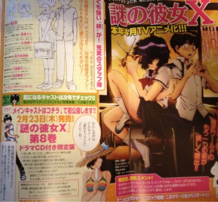 So here’s the first look at this April’s Nazo no Kanojo X anime television series, an adaptation of Riichi Ueshiba’s ongoing romantic comedy manga. Hoods Entertainment (Seikon no Qwaser) will animate with veteran Doraemon movie assistant director Ayumi Watanabe directing and Kaneko Sizue serving as animation director.