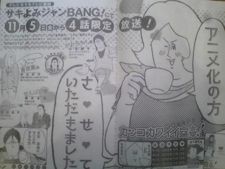 The November issue of Jump Square magazine that officially goes on sale in Japan next week will formally announce the development of 4 anime shorts based on Jigoku no Misawa’s gag comedy manga Kakko Kawaii Sengen! The four weekly animated segments will air within the Saki-yomi Jum-Bang! television series beginning November 5.