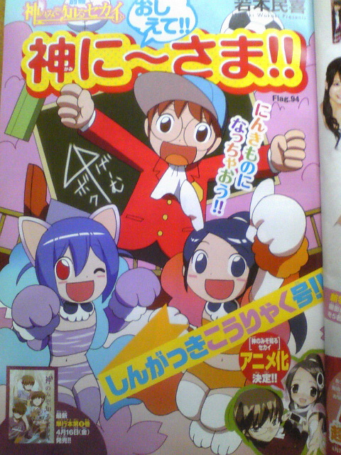 Next week’s issue of Shonen Sunday magazine reportedly contains an announcement that Tamiki Wakaki’s romantic comedy manga serial Kami no Mizo Shiru Sekai (The world God Only Knows) will be getting an anime adaptation. The story revolves around schoolboy Keima Katsuragi, known as the “Capturing God” because of his skill at capturing the hearts of female characters in dating simulation computer games. The devil charges him with using his charms on real women to catch the runaway spirits that hide in women’s hearts.
