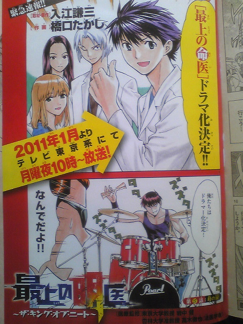 Reportedly next week’s issue of Weekly Shonen Sunday magazine will formally announce the development of a live action TV drama based on Takashi Hashiguchi and Kenzo Irie’s current manga Saijo no Meii (The Best Skilled Surgeon). The manga series stars a young man who was saved during his infancy by a skilled pediatric surgeon. To express his gratitude, the young man decides to himself become the world’s greatest pediatric surgeon. The series will premiere next January.