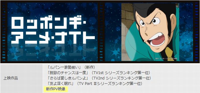 The Toho Cinemas Roppongi Hills theater in Tokyo will host a Lupin III 40th anniversary publicity event on the 18th. According to advance advertising, the event will include a formal announcement of a new Lupin III television series premiering in April.
