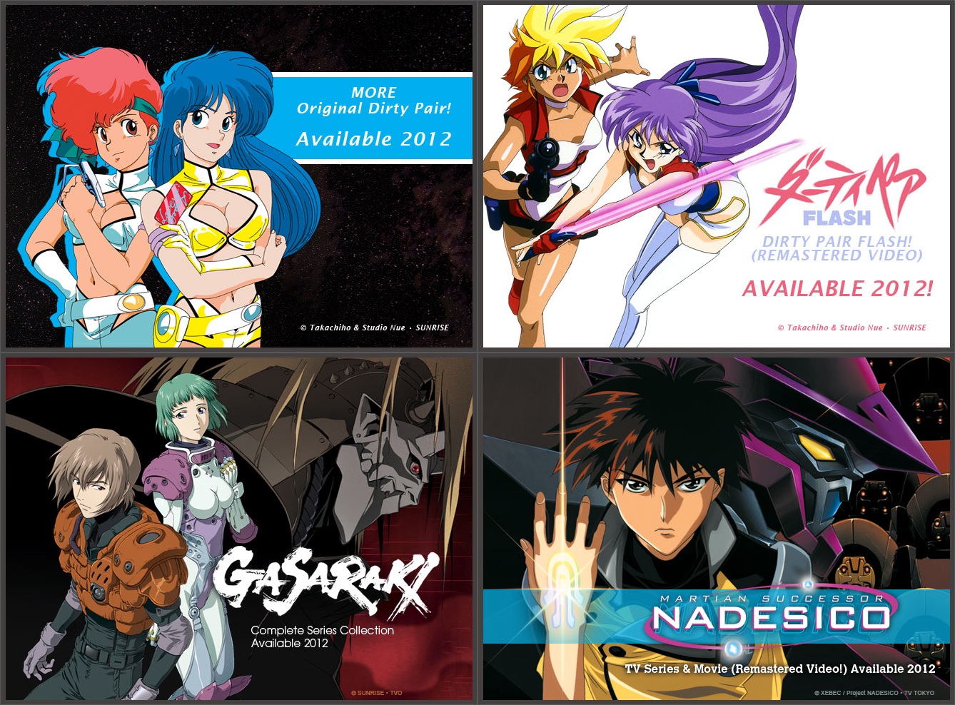 Nozomi Entertainment has picked up a selection of domestic license-rescues: The “Original” Dirty Pair OVA series, the “Affair of Nolandia” and “Flight 005 Conspiracy” OVAs, the “Project EDEN” motion picture, the 16 episode Dirty Pair Flash OVA series, the Martian Successor Nadesico television series, movie, and Gekiganger-III OVA, and the Gasaraki television series. The Nadesico: Gekiganger-III OVA which bridges the time gap between the end of the television series and beginning of the motion picture has never been officially released in America before.