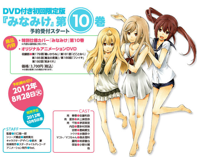 The 10th compiled volume of Coharu Sakuraba’s Minami-ke manga will be released this October in a limited edition that includes a bonus anime episode on DVD. The series’ first OAD, Minami-ke: Betsubara, was released in 2009 with the sixth manga volume. Studio feel (Mayo Chiki!) will animate the fourth season of the anime TV series, which will premiere this winter.