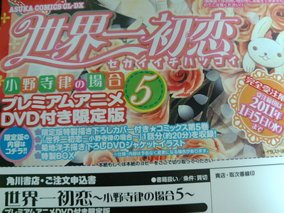 The premium edition of the fifth volume of Shungiku Nakamura’s boy-love manga Sekai-ichi Hatsukoi ~Onodera Ritsu no Baai~ (World’s Best First Love ~The Case of Ritsu Onodera~) will include a bonus 20 minute anime on DVD. Studio DEEN will animate the exclusive episode with Chiaki Kon (Hanasakeru Seishounen, Junjo Romantica) directing and Yoko Kikuchi (El Cazador, Junjo Romantica) providing character design.