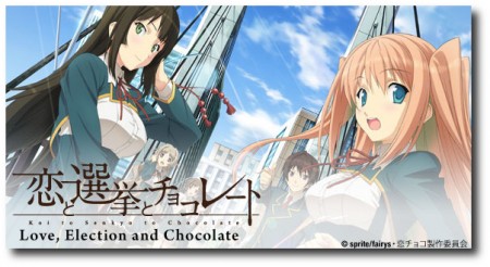 Sentai Filmworks has announced its acquisition of the current Koi to Senkyo to Chocolate (Love, Elections, & Chocolate) anime television series. The adaptation of of sprite/fairys’ 2010 adult PC game depicts a high school boy pressured into running for a position on his school’s student council in order to save his “cooking club” from forced disolution. The Anime Network has begun streaming the series.