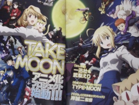 This week’s new January issue of Monthly Comic Rex magazine officially announces the development of an anime based on Eri (Kannagi) Takenashi’s two volume Take Moon collection of parodies and homages of Type-Moon franchises including Tsukihime, Kagetsu Tohya, and Fate/stay night. Seiji Kishi (Angel Beats!, Seto no Hanayome) will direct.
