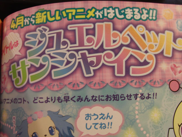 Jewelpet Sunshine will premiere on April 2, taking over the timeslot of the currently airing Jewelpet Twinkle television series. The Jewelpet anime franchise, based on Sanrio & Sega’s toy franchise, launched in April 2009.