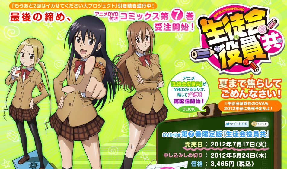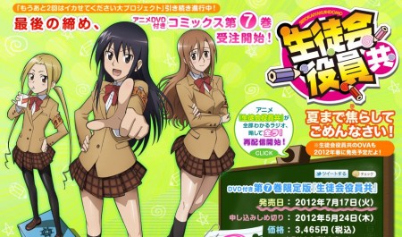 Kodansha has announced that the seventh collected volume of Tozen Ujiie’s school comedy manga series Seitokai Yakuindomo will be released on July 17, 2012 in a limited edition that includes the franchise’s third OAD. The risqué series’ second OAD episode was released with the sixth manga volume earlier this week.