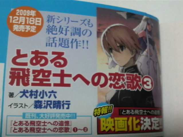 An unconfirmed image ad for author Koroku Inumura’s third To Aru Hikushi e no Tsuioku (Flashbacks to a Certain Aerial Pilot) light novel states that a film adaptation of the series is in development. The ad doesn’t specify whether the movie will be anime or live action. The first book in the fantasy adventure series about a mercenary pilot charged with flying a princess 12,000 kilometers across enemy waters debuted in February 2008. To Aru Hikushi e no Tsuioku volume 3 (actually the fourth novel in the series), goes on sale in Japan on the 18th.